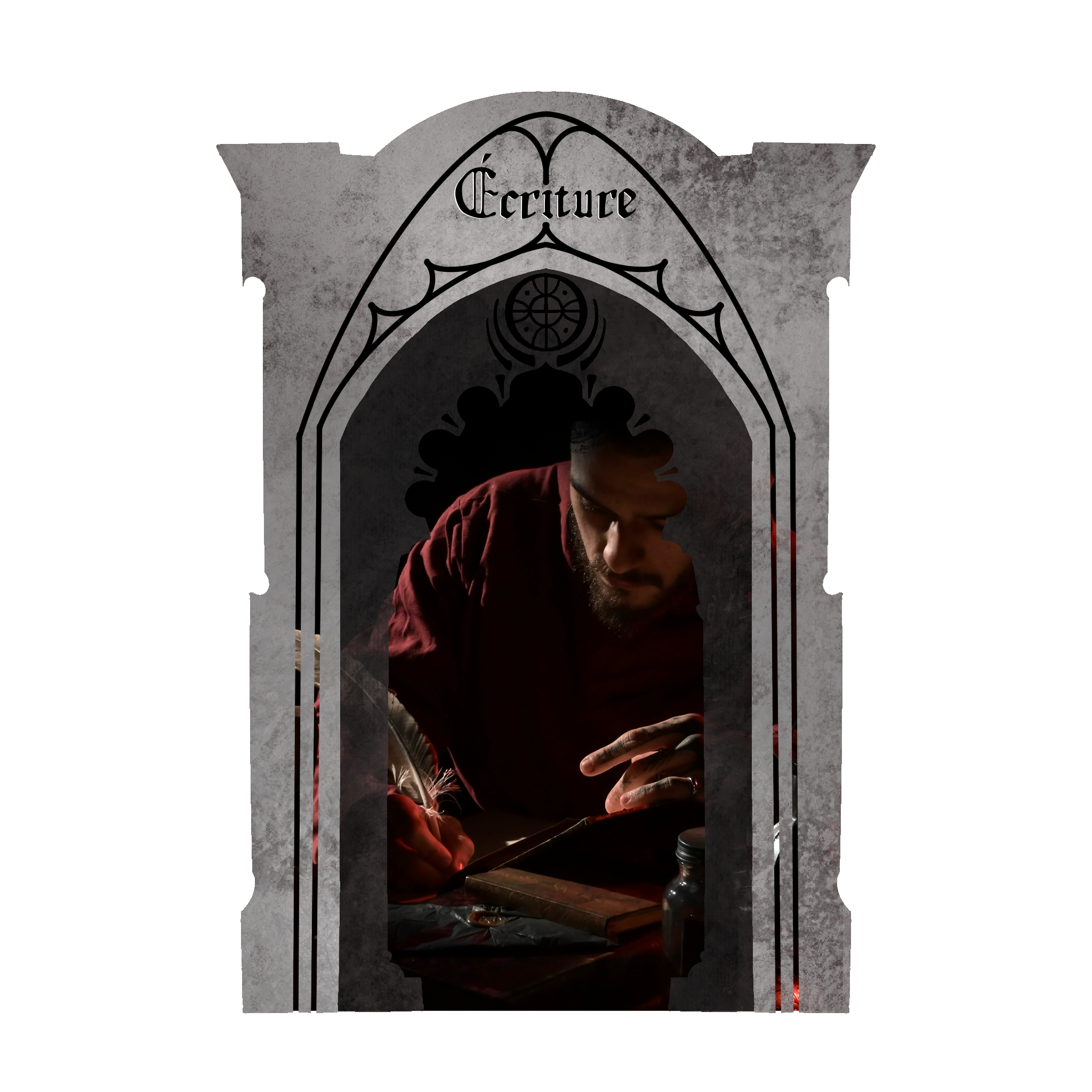 Je développe un style gravure et illustratif médiéval, agrémenté de symboles, de calligraphies et d’une touche de rouge. J'encre des personnages & créatures légendaires, des symboles mystiques ou des compositions ornementales souvent inspirés de mon univers.